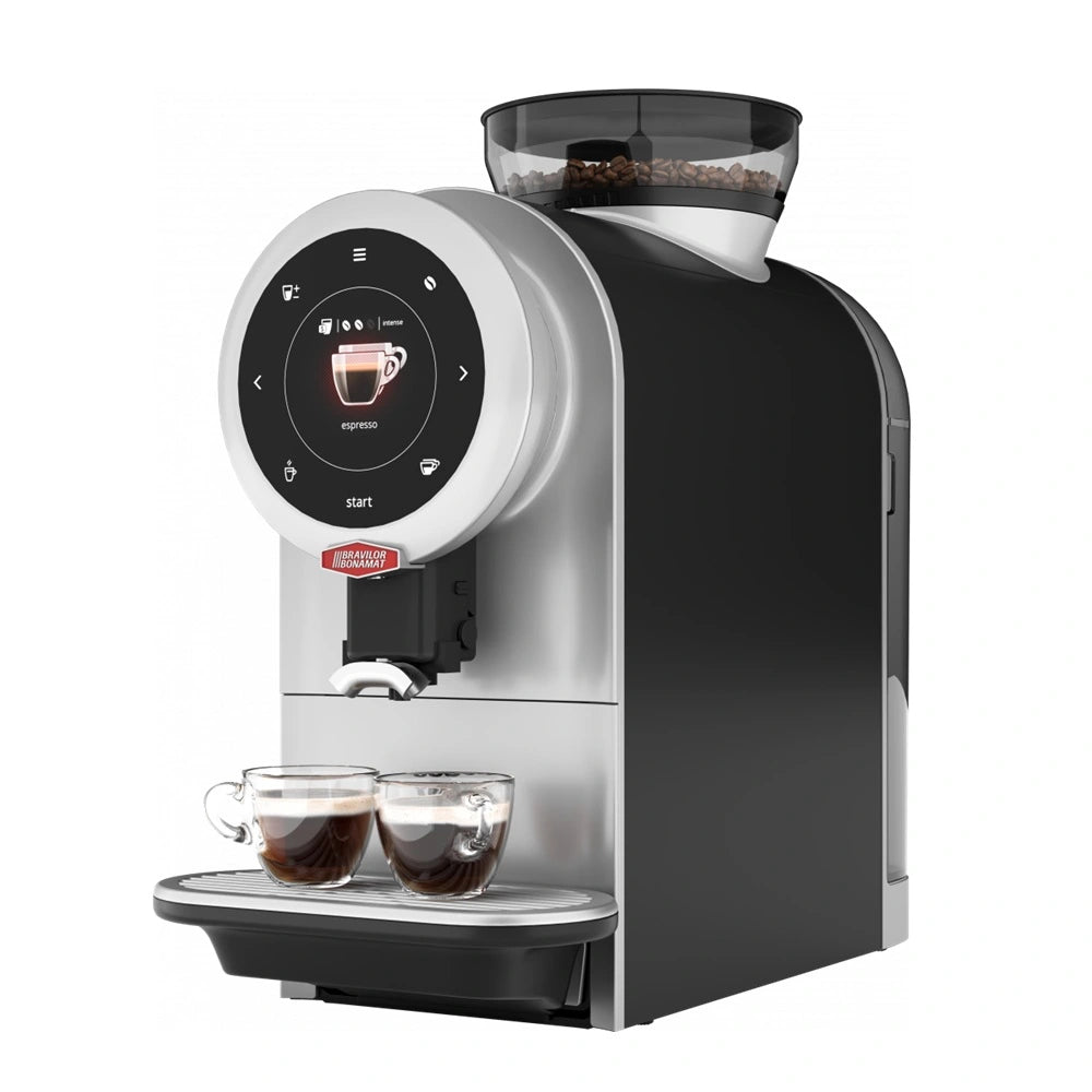 Compact and fully automatic, the Bravilor SPRSO is ideal for locations with a daily demand of up to 30 cups. This bean-to-cup espresso machine expertly crafts coffee specialities using freshly ground beans and fresh milk (with an optional milk frother), making it suitable for sites with or without a direct water connection. With an intuitive touchscreen, 14 pre-set drinks, a stainless steel disc grinder, and a low-maintenance CIRCO-brewer, it offers a smooth, hassle-free experience from the start. Simply unpack, plug in, and it’s ready to use within 10 minutes.